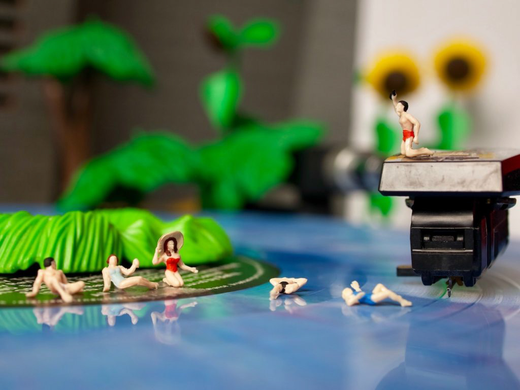 L’idée n’est pas simplement de mettre en scène des “jouets”, mais de transformer les objets du quotidien en décors crédibles à l’échelle de ces personnages : une tasse devient un bassin, des miettes un paysage, un disque vinyl une piste de course.